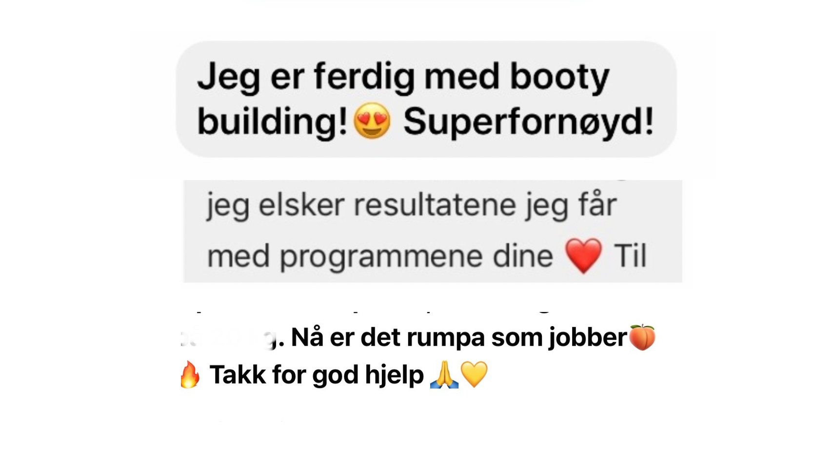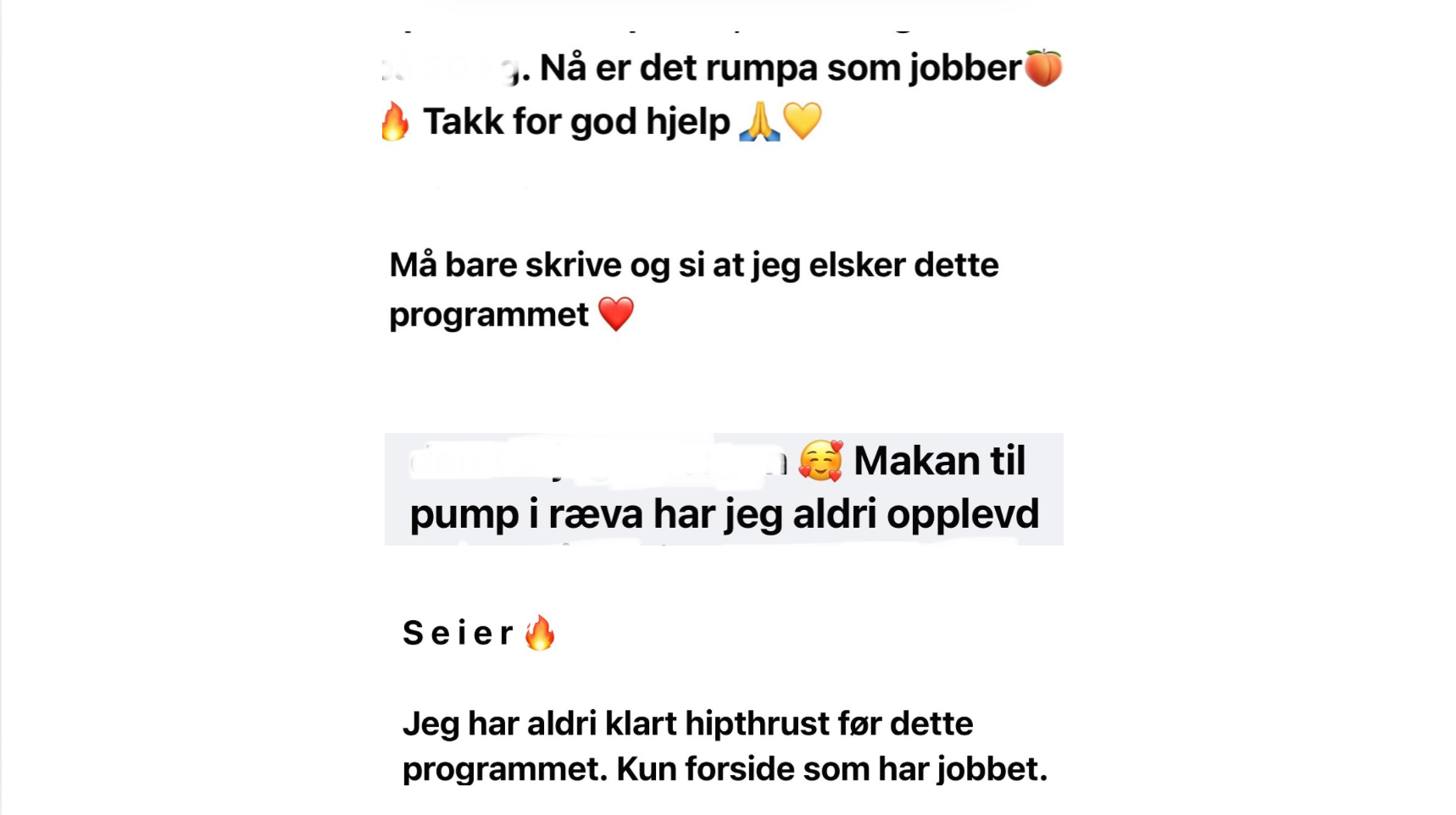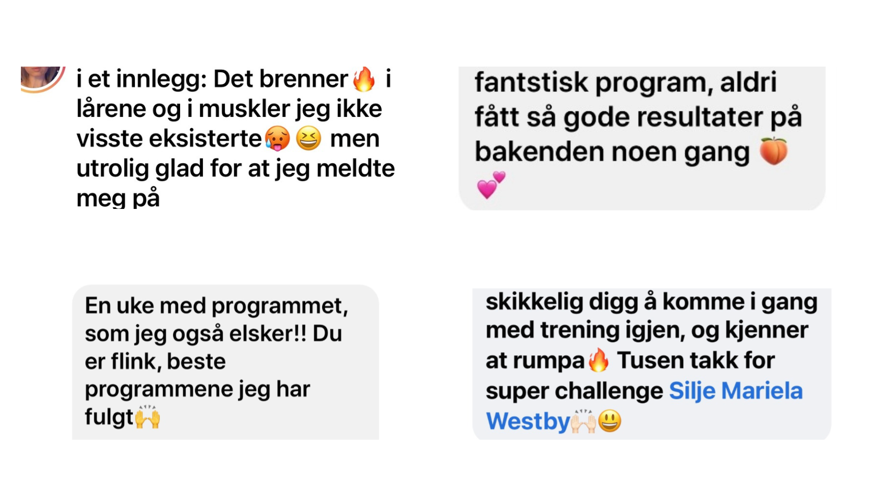 "Jeg har aldri fått så mange kommentarer på rumpa mi som etter at jeg fikk hjelp av Silje! Ikke bare har jeg fått sprettrumpe, men jeg har også fått styrke, treningsglede og skikkelig mestringsfølelse!"