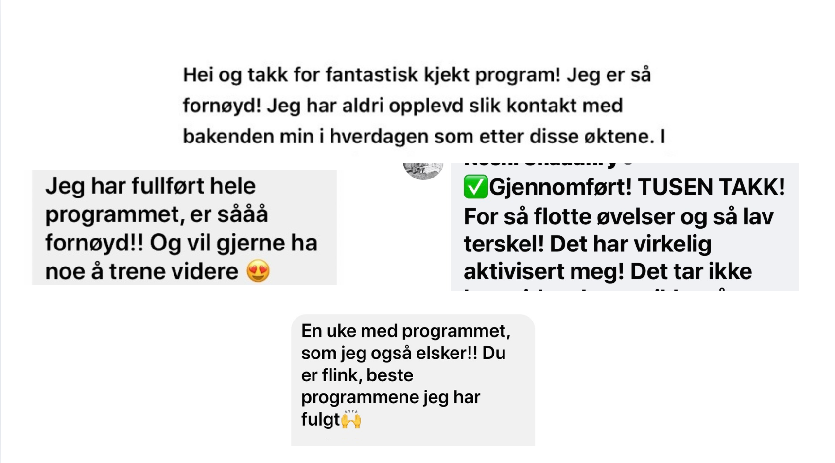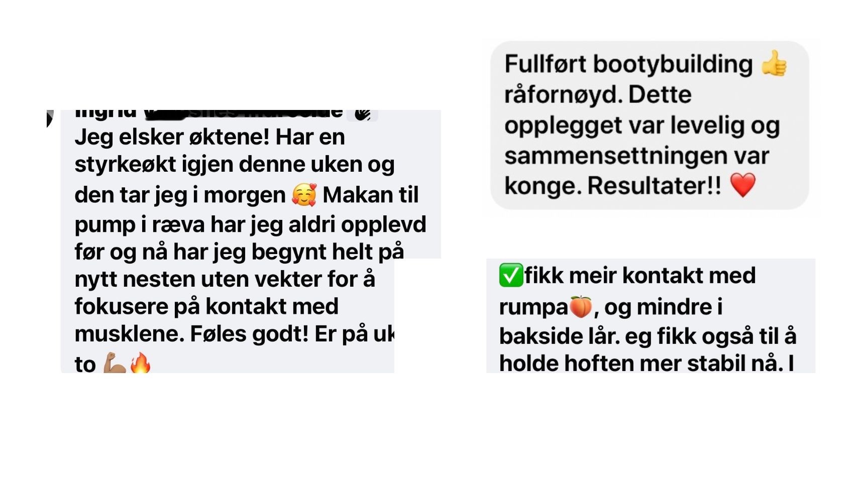 "Hele opplegget fungerer veldig bra. Jeg trives så utrolig godt med øktene, og jeg har fått råe resultater! Jeg har blitt sterkere, fått mer muskelmasse på hele kroppen og spesielt på rumpa, den utmerker seg."